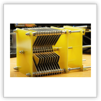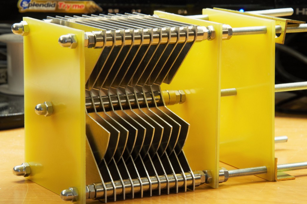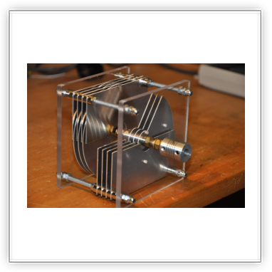 Der hier abgebildete Drehkondensator ist als Splitt-Kondensator ausgeführt. Wir haben die Stator- und Rotorteile aus 1mm starkem Alublech gefräßt.
