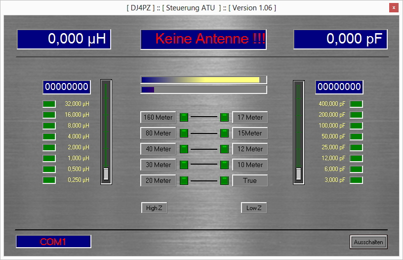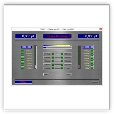 Bei diesem Screenshot handelt es sich um die Bedienoberfläche des symm. Kopplers "S-Match". Hiermit ist die binäre Steuerung der L- und C-Komponenten via RS323 / RS485 möglich. Mit dieser Konsole kann im Prinzip jeder LC-Koppler gesteuert werden, Voraussetzung hierfür ist die binäre Steuerung von L und C. Als Beispiel wären hierfür die Koppler von DL3LAC (Christian-Koppler) zu nennen. Andere Koppler funktionieren natürlich ebenso, solange diese auf dem vorgenannten Prinzip basieren.